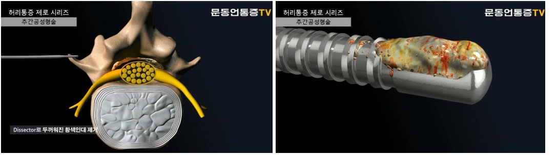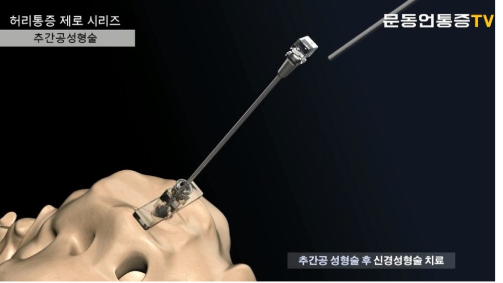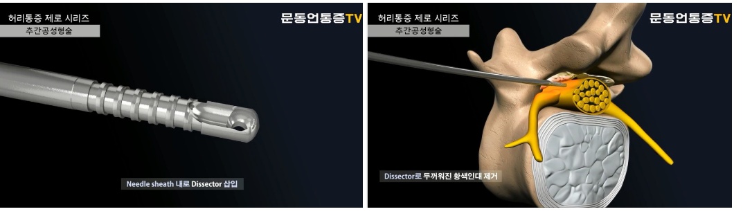 문동언통증의학과 문동언대표원장님이 특수 고안한 기구를 옆구리를 통하여 영상장치를 보면서